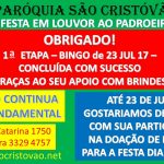 Com a ajuda de muitos paroquianos que prontamente atenderam ao chamado, já foram arrecadados os prêmios para o Bingo do dia 23/07 (domingo que antecede a festa). Aos que já participaram, segue o nosso muito obrigado!