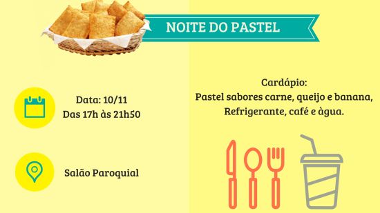 29 de outubro de 2018 por admin Noite do pastel – 10/11 Dia 10/11 teremos a Noite do Pastel. Vendas a partir das 17h. no Salão Paroquial. Pode- se fazer a reserva antes da Missa e pegar no final. Participe.
