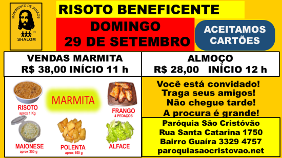 . Neste final de semana teremos o tradicional almoço do Movimento de Irmãos, galeto, polenta frita, risoto, saladas de maionese e alface, venham participar: